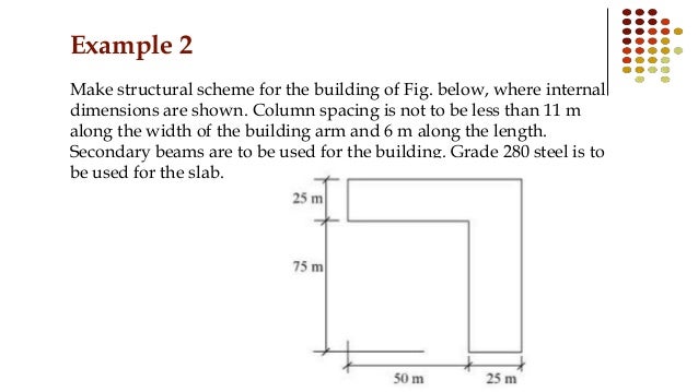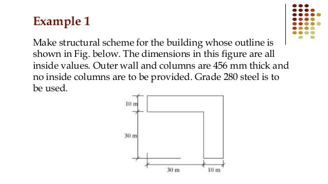 - 10. Example 1 Make structural scheme for the building whose outline is shown in Fig. below. The dimensions in this figure are all inside values. Outer wall and columns are 456 mm thick and no inside columns are to be provided. Grade 280 steel is to be used.