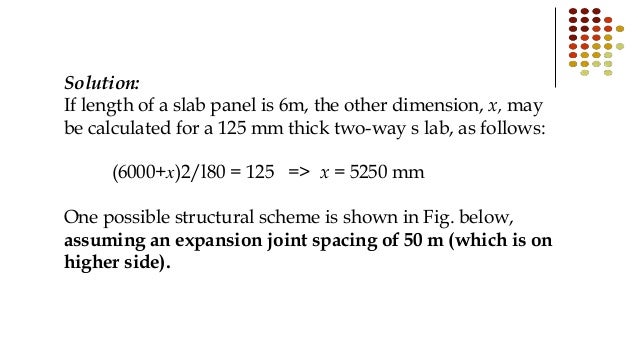 - 13. Solution: If length of a slab panel is 6m, the other dimension, x, may be calculated for a 125 mm thick two-way s lab, as follows: (6000+x)2/l80 = 125 => x = 5250 mm One possible structural scheme is shown in Fig. below, assuming an expansion joint spacing of 50 m (which is on higher side).