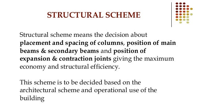 - 2. STRUCTURAL SCHEME Structural scheme means the decision about placement and spacing of columns, position of main beams & secondary beams and position of expansion & contraction joints giving the maximum economy and structural efficiency. This scheme is to be decided based on the architectural scheme and operational use of the building