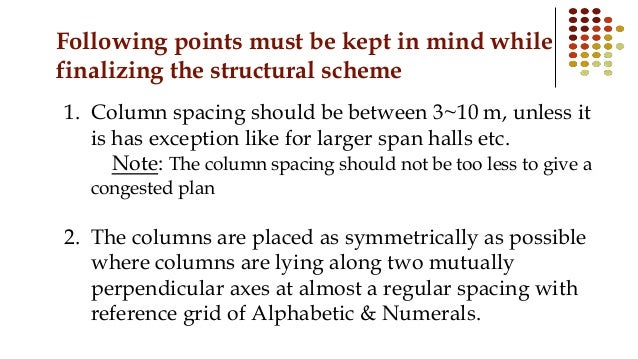 - 3. Following points must be kept in mind while finalizing the structural scheme 1. Column spacing should be between 3~10 m, unless it is has exception like for larger span halls etc. Note: The column spacing should not be too less to give a congested plan 2. The columns are placed as symmetrically as possible where columns are lying along two mutually perpendicular axes at almost a regular spacing with reference grid of Alphabetic & Numerals.