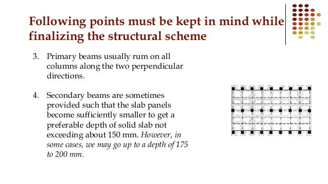 - 5. Following points must be kept in mind while finalizing the structural scheme 3. Primary beams usually rum on all columns along the two perpendicular directions. 4. Secondary beams are sometimes provided such that the slab panels become sufficiently smaller to get a preferable depth of solid slab not exceeding about 150 mm. However, in some cases, we may go up to a depth of 175 to 200 mm.