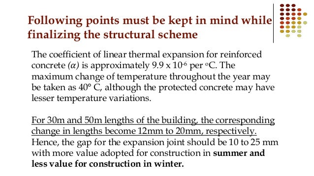 - 7. Following points must be kept in mind while finalizing the structural scheme The coefficient of linear thermal expansion for reinforced concrete (𝛼) is approximately 9.9 x 10-6 per oC. The maximum change of temperature throughout the year may be taken as 40° C, although the protected concrete may have lesser temperature variations. For 30m and 50m lengths of the building, the corresponding change in lengths become 12mm to 20mm, respectively. Hence, the gap for the expansion joint should be 10 to 25 mm with more value adopted for construction in summer and less value for construction in winter.