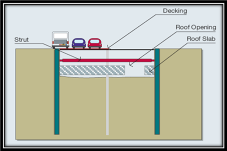The soil is excavated just below roof slab level of the underground structure. Struts are installed to support the retaining walls, which in turn support the soil at the sides